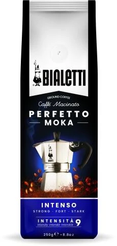 Bialetti Kaffee Perfetto Moka Intenso. Gemahlener Kaffee vom Erfinder der Moka Express und genau auf diese Art der Zubereitung abgestimmt. Perfekt geröstet – perfekt gemahlen – perfekter Geschmack!