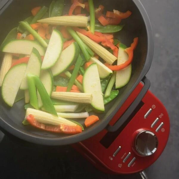 - Material: Gehäuse aus Spritzgussmetall, Hebel und Knopf aus Metall, Kochtopf aus Edelstahl, Deckel aus BPA-freiem Kunststoff, Kochplatte aus Aluminium