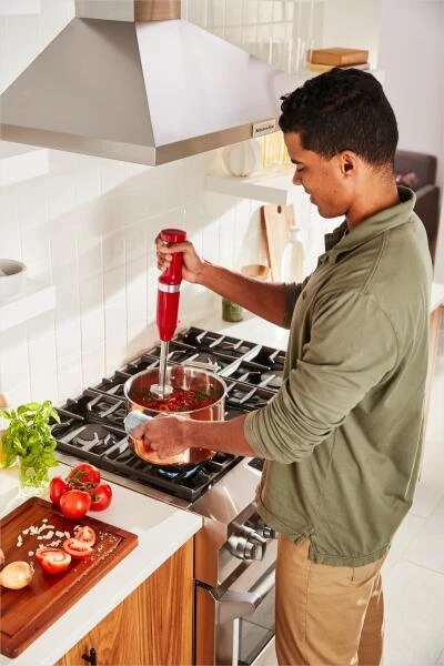 KitchenAid Kabelloser Stabmixer in empire rot. Der Mixer mit variablem Geschwindigkeitsregler. Mit wiederaufladbarem Akku und mit voller Bewegungsfreiheit in der Küche ohne Kabelsalat. Mit ca. 2h Akku-Laufzeit. Inklusive Zubehör.
