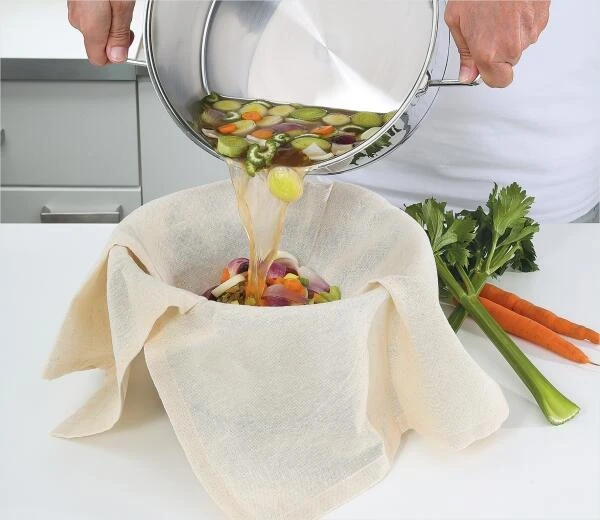Küchenprofi Passiertuch in den Maßen 80 x 65 cm. Bewährter Klassiker zum extra feinen Abgießen, Passieren und Filtern. Ideal für klare Suppen und Soßen, dem Auspressen von Kloßteig oder dem Herstellen von veganer Milch und hausgemachtem Käse. Das Passiertuch von Küchenprofi ist reißfest und wiederverwendbar