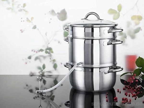 Der Dampfentsafter Loop von Schulte-Ufer ist ein Muss für leidenschaftliche Obstgärtner! Mit dem Topf lassen sich leicht mittelgroße Mengen an Obst verarbeiten. Durch die Dampfgarmethode bleiben die wertvollen Vitamine erhalten und die Saftausbeute ist hoch. Der Entsafter besteht aus einem Topf, Obst- und Entsaftungsaufsatz sowie Zubehör. Diese Teile sind zudem multifunktional einsetzbar: Das Unterteil ist als Topf nutzbar, der Dämpfeinsatz als Ablaufsieb sowie Topf und Dämpfeinsatz als Dämpfer.