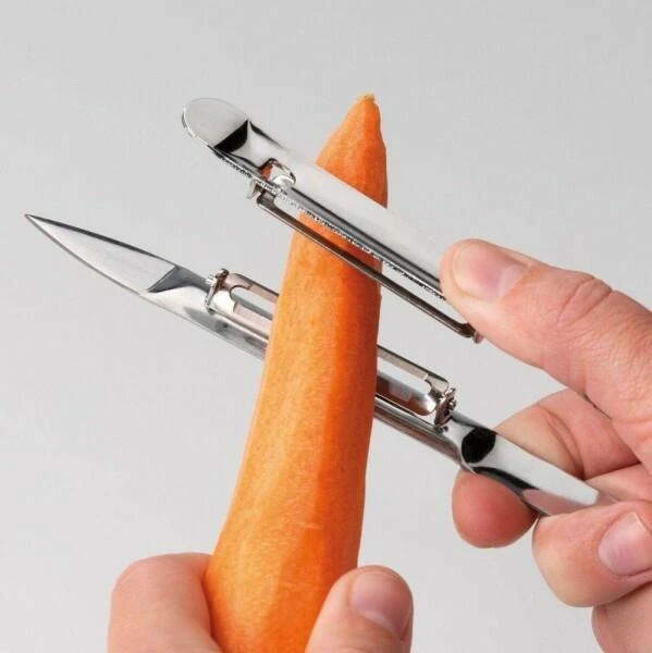 Sauber schneiden und fein schälen: Eine ebenso gesunde wie innovative Gemüseküche verlangt professionelle Verarbeitungstechniken und ermüdungsfreies Arbeiten. Schneiden Sie Ihr Gemüse gleichzeitig beidseitig. Zwei bewegliche Klingen passen sich der Kontur des Lebensmittels an. Damit lässt sich das Langgemüse ohne großen Aufwand noch schneller schälen.