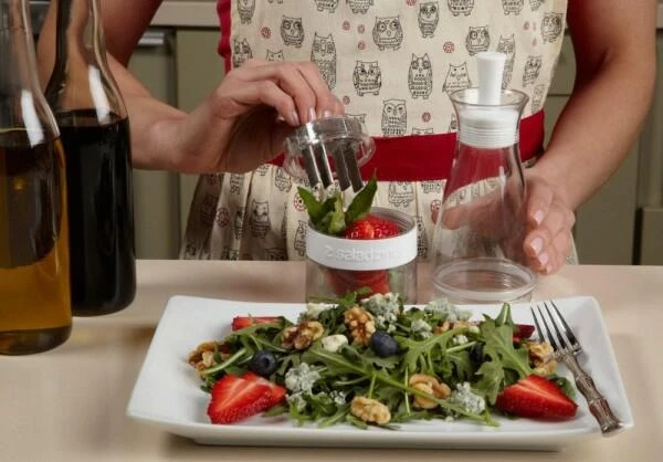 So einfach funktioniert der Salad Zinger: Füllen Sie einfach die gewünschten Zutaten in das Mahlwerk (Knoblauch, Zwiebel, Zitrusfrüchte, Gewürze, Obst, etc.), fügen Sie Essig und Öl hinzu, schütteln Sie und verteilen das Dressing über Ihrem Salat!